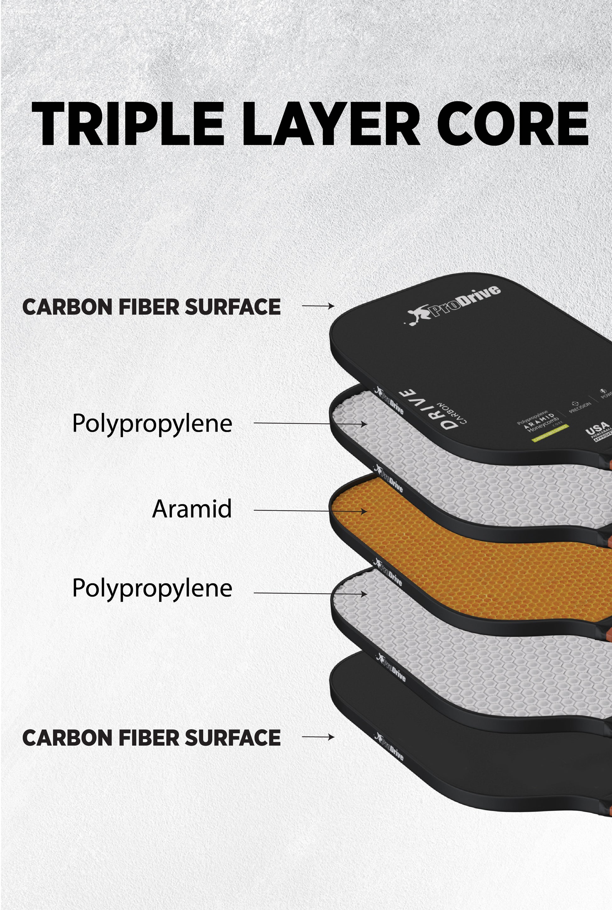 The Carbon Drive paddle is the pinnacle of paddle design. This 19mm paddle offers everything you would look for in a paddle - the touch/control of a 19mm with the power of a thinner paddle due to the revolutionary 3 layer core. The inner and outer layers are Polypropylene (PP) and the center layer is Aramid (Kevlar). When the center layer is compressed with a faster swing, the Aramid kicks in to add the power you are looking for.