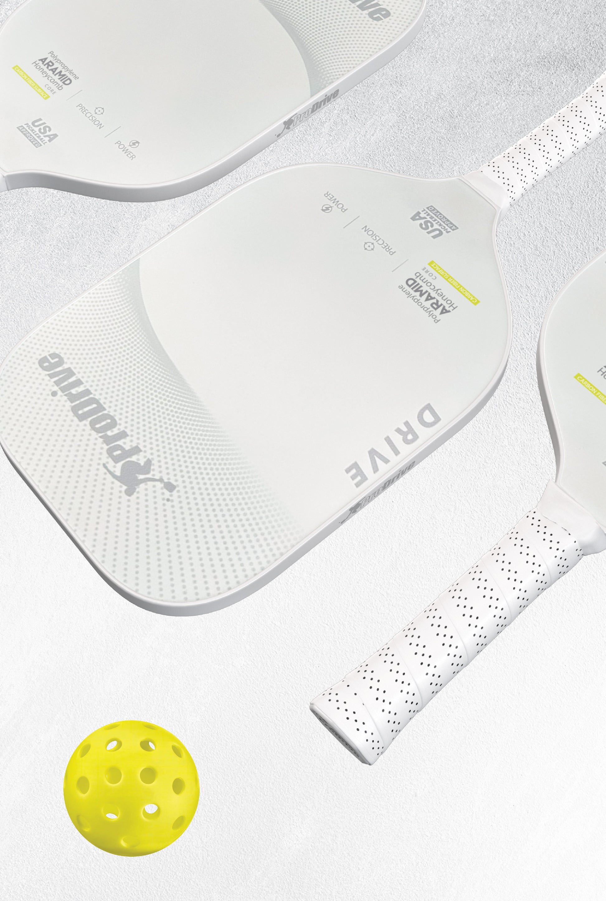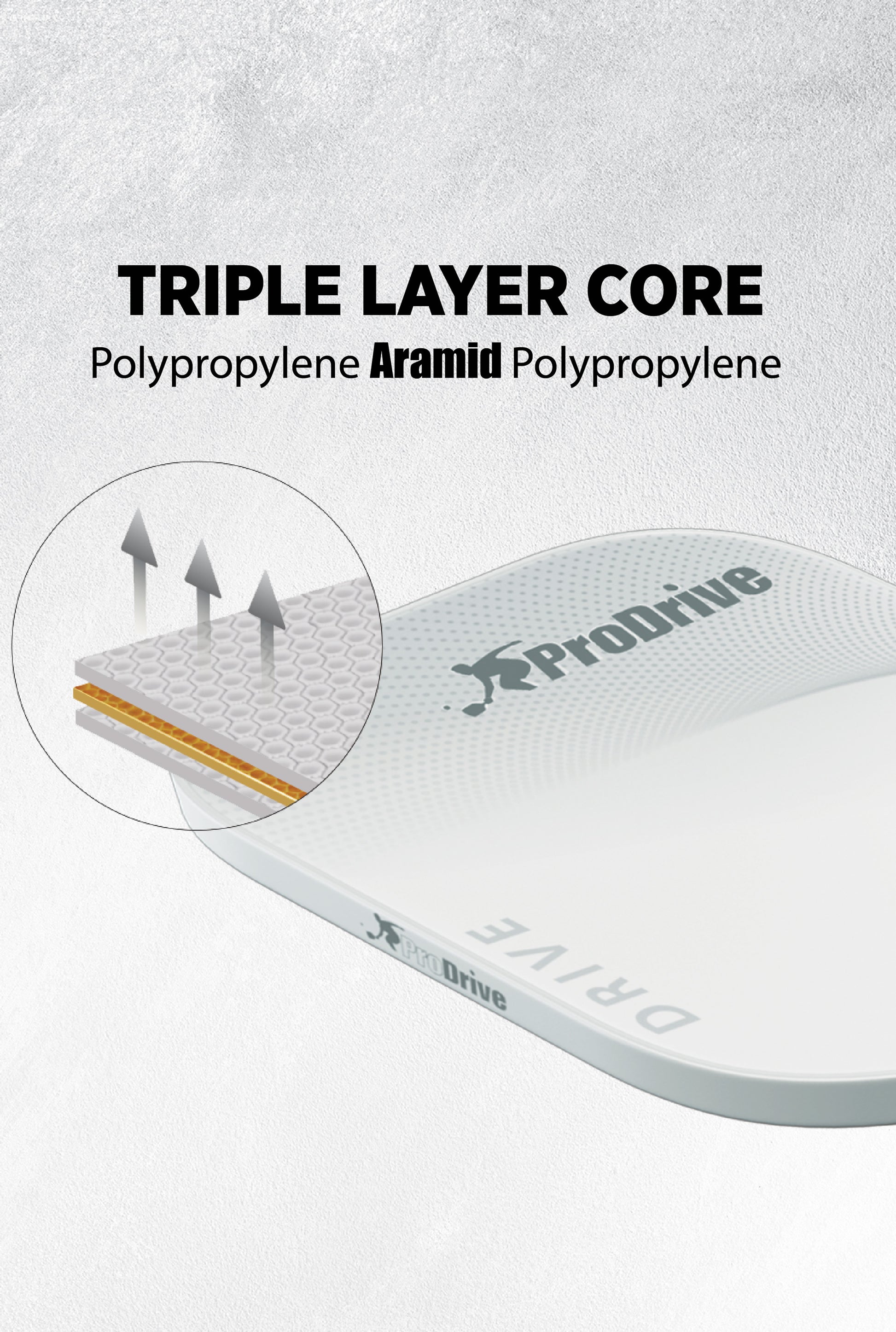 The Drive White paddles are the pinnacle of paddle design. This 19mm paddle offers everything you would look for in a paddle - the touch/control of a 19mm with the power of a thinner paddle due to the revolutionary 3 layer core. The inner and outer layers are Polypropylene (PP) and the center layer is Aramid (Kevlar). When the center layer is compressed with a faster swing, the Aramid kicks in to add the power you are looking for.