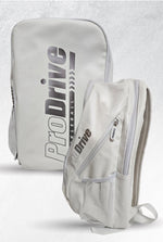 ProDrive´s Backpack is a luxury bag in white PU leather with chrome cosmetics. This bag can hold up to 3 paddles and all your extra gear for a day on the court. The two main compartments have interior pockets as well. There are 2 outside pockets that can hold your valuables - keys, wallet, phone, etc. Each side also has a mesh pocket for a water bottle. The bottom of the bag has a separate space for shoes or sweaty clothes